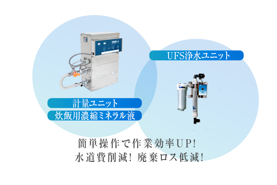 品質が向上した無洗米を、0.01ミクロン孔UFろ過器と活性炭フィルターで水質を安定させ、炊飯用ミネラルでご飯に最適なミネラルバランスに改善。更に、補正機能付き自動加水計量装置で、誰でも簡単に正確にワンタッチ加水できます。