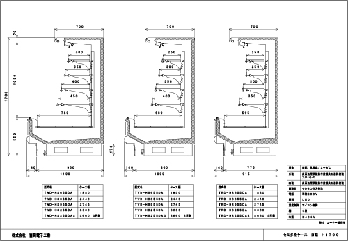日配・乳製品陳列用途、棚4段、ケース高さ1700mmの冷凍機別置型ショーケースです。